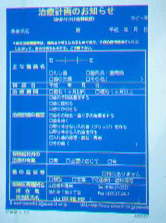 その後、改定された治療計画書が、北海道歯科医師会から出されました。改定の図は、やはり山田歯科で改良したものですが、記入が簡単になりました。これを臨床で使用するのは、時間がかからなく良いのですが、その分患者さんに内容が十分にわからない欠点があります。
