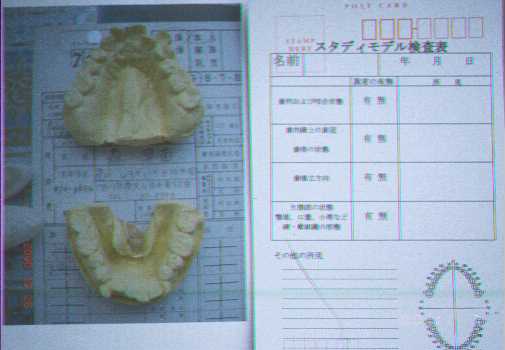最後にスタディモデルについてですが、平成12年4月より、模型からより詳しく口腔内の状態を記録するようになりました。これも、デジタルカメラではがき用紙プリントしてに撮影して、裏面(スタディモデル検査表)に図の形式で内容を記入して、カルテに貼り付けます。これで、検査内容は十分です。