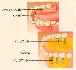 年齢その他で、インプラントができない場合がありますか? インプラントは、体調に問題がなければ、若い人から 高齢で顎(あご)の骨の少ない方は、特別の方法でイ ンプラントをすることもできますので、担当の先生に ご相談下さい。 |