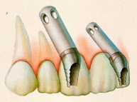 「インプラント」とは、どんな治療法ですか? 「インプラント」とは、歯の抜けた所に、人工の歯根を植え、 しっかりと顎(あご)の骨と固定した後、その上に人工の歯 を制作し装着する方法です。天然歯と同様の、健全な咀嚼 運動 (噛み砕き、飲み込む運動)ができるようになります。 |